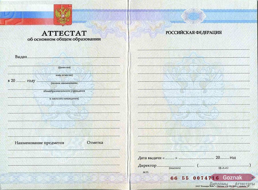 Компания «Гознак-Дипломы» успешно работает на рынке более 15 лет и предлагает Вам купить аттестат за 9 класс 2007 - 2009 гг. выгодно по хорошим ценам на настоящем бланке Гознак с оригинальными печатями и подлинными подписями. Документы имеют все степени защиты, оформлены по государственным нормам и с учетом особенностей конкретных учебных заведений. Аттестат за 9 класс 2007 - 2009 гг. на 100% соответствуют подлинникам, поэтому проблем точно не доставят, которые без опаски можно предоставлять в отдел кадров: