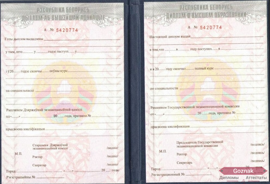 Диплом о высшем образовании Белоруссии 1994 - 2010 гг. заполняется профессиональными специалистами по установленным правилам и нормам министерства образования РФ. Документ на 100% соответствует всем требованиями Министерства Образования и Науки РФ.