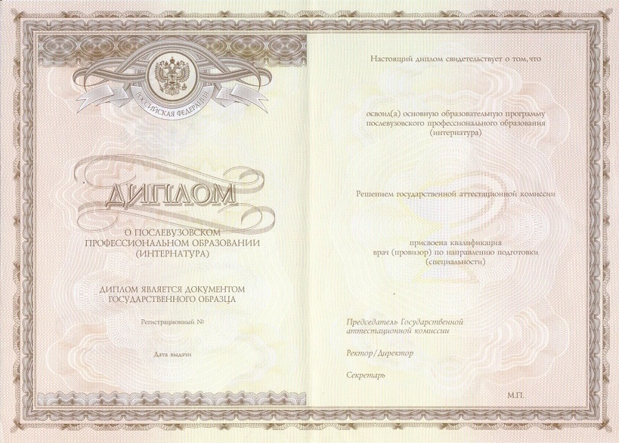 Дипломы интернатуры заполняется профессиональными специалистами по установленным правилам и нормам министерства образования РФ. Документ на 100% соответствует всем требованиями Министерства Образования и Науки РФ.