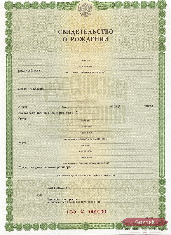 Компания «Гознак-Дипломы» успешно работает на рынке более 15 лет и предлагает Вам купить свидетельство о рождении 1998 - 2025 гг. выгодно по хорошим ценам на настоящем бланке Гознак с оригинальными печатями и подлинными подписями. Документы имеют все степени защиты, оформлены по государственным нормам и с учетом особенностей конкретных учебных заведений. Свидетельства о рождении 1998 - 2025 гг. на 100% соответствуют подлинникам, поэтому проблем точно не доставят, которые без опаски можно предоставлять в отдел кадров: